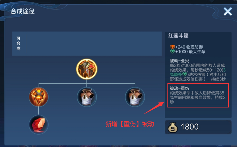 :燃烧效果使敌人的生命恢复和偷血效果降低35%,后期的伤害会比之前更高 。但是削弱了六级之后的伤害。原来用不了的机制被小冲刺所取代。重伤装备削弱的很大原因就是红莲斗篷的变化。全球生效) 多人购买漫游装备时, 红莲斗篷一直是边坦和丛林坦克的核心装备